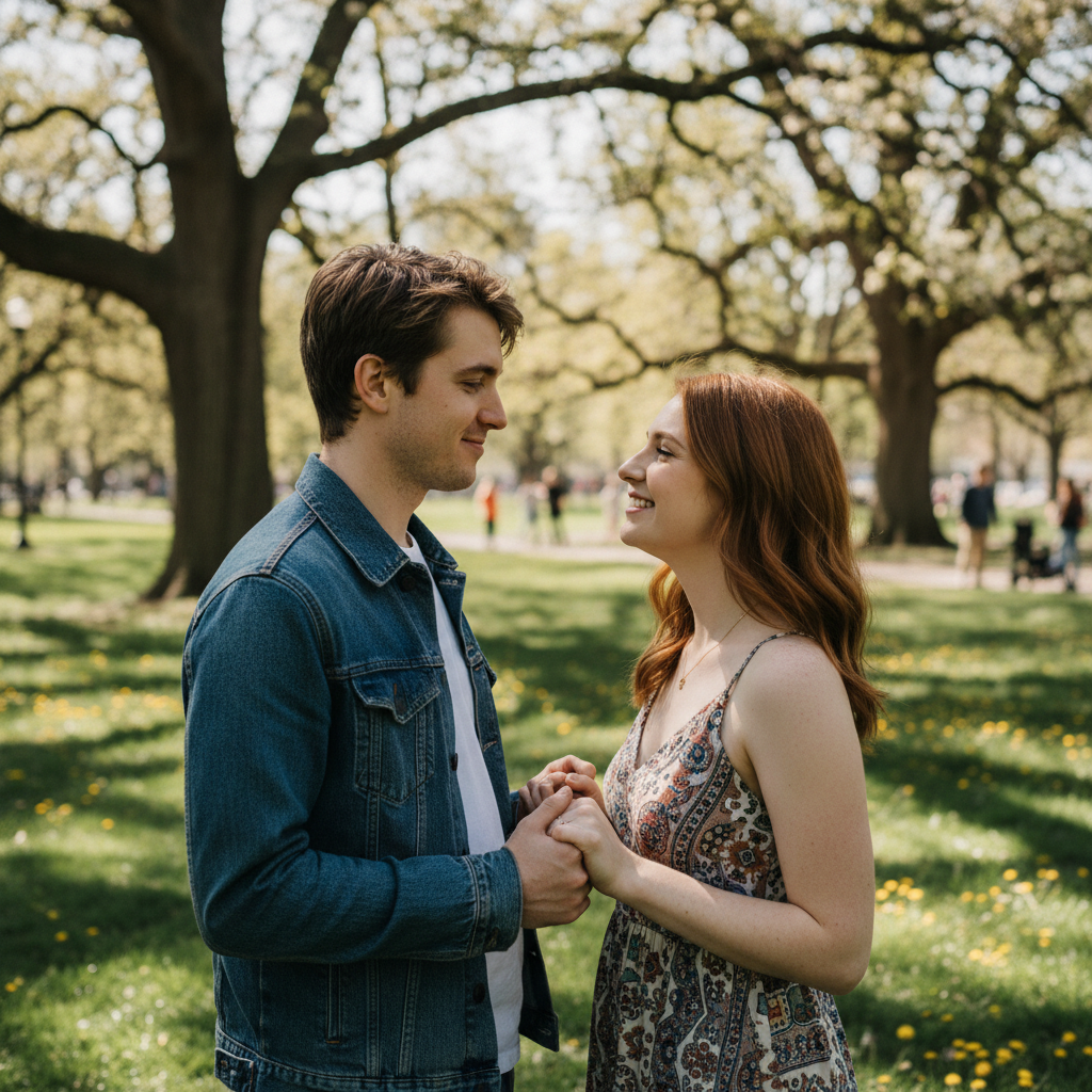 Zdjęcie: Para patrząca sobie w oczy w parku, symbolizująca autentyczne dopasowanie. Słowa kluczowe: autentyczne dopasowanie, opinie użytkowników, randki online.
