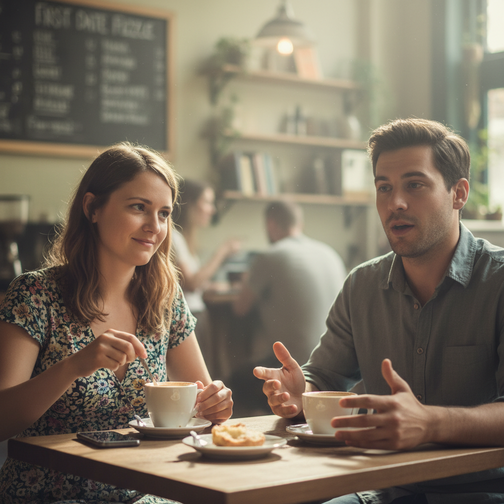 Randka w kawiarni, gdzie para skupia się na powierzchownych cechach, ilustruje pułapkę pierwszego wrażenia.